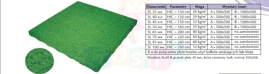 Płyty gumowe typu SL to innowacyjne rozwiązanie płyt, które charakteryzują się większą niż dotychczas krytyczną wysokością upadku (HIC). Płyty gumowe typu SL układać można na twardym (beton, płyty chodnikowe, asfalt) i utwardzonym podłożu (ubity żwir i piasek). Płyty są produkowane o różnych grubościach i dobierane do montażu w zależności od wymaganej krytycznej wysokości upadku.