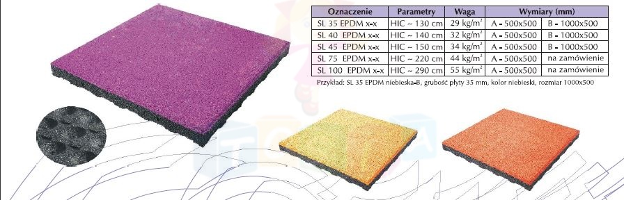 Płyty z powierzchnią EPDM to dwuwarstwowe płyty z widoczną zewnętrzną kolorową powierzchnią. Zaletą płyty SL EPDM jest to że przy prawidłowej konserwacji nie traci trwałości kolorów. Płyty te szczególnie polecane sa na place zabaw dla dzieci, gdzie ich kolory znacząco ożywiają powierzchnię do zabawy. Można je również stosować jako nawierzchnie sportowe, płyty do ogrodu czy otoczenia domów mieszkalnych. Płyty z powierzchnią EPDM posiadają wszystkie certyfikaty niezbędne do wykorzystania ich na placach zabaw dla dzieci i spełniają wymogi norm wymaganych w Unii Europejskiej.