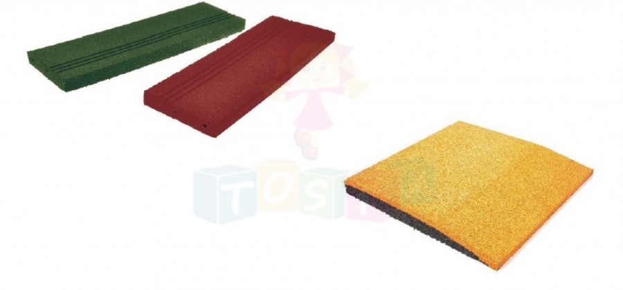 Krawężniki gumowe są używane w celu ograniczenia bezpiecznego obszaru absorbującego upadek. Podstawowe wymiary krawężników 1000x250x50 mm. Elastyczne właściwości krawężników pozwalają na formowanie łuków. Dostępne kolory: czarny, czerwony, zielony i szary
