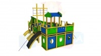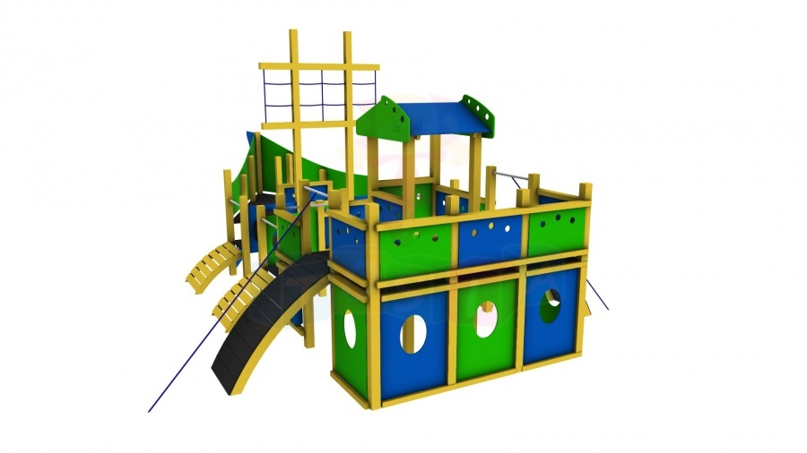 Wszystkie urządzenia wykonane są z drewna klejonego ; kantówki sosnowej, zabezpieczonej przed wpływem czynników atmosferycznych przez malowanie preparatem naturalnym. Elementy konstrukcyjne utwierdzone w gruncie za pomocą kotew stalowych przytwierdzonych do fundamentów punktowych. Zjeżdżalnie ze stali kwasoodpornej. Elementy meta-lowe ocynkowane. Liny atestowane o podwyższonej trwałości. Elementy pełne ; w tym daszki, bariery, osłony, zabezpieczenia zjeżdżalni i inne wykonane z płyty HDPE. Polietylen (HDPE) nie nasiąka wodą, nie pęcznieje, nie rozwarstwia się ani nie łamie. Jest to materiał odporny na trwałe zabrudzenia oraz graffiti. Posiada Atest PZH.